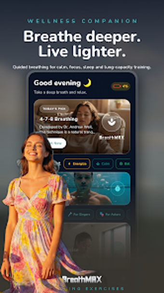 BreathMAXは、呼吸の実践と全体的な健康を改善するために設計された無料のAndroidアプリです。バランス、落ち着き、活力、集中、リラックス、そして高揚など、さまざまな気分のカテゴリがあり、異なる感情的および身体的ニーズに対応しています。ユーザーは、歌手やアスリートなどの専門家向けに設計されたプレセットや、個別のルーチンのためのカスタムパターンビルダーにもアクセスできます。